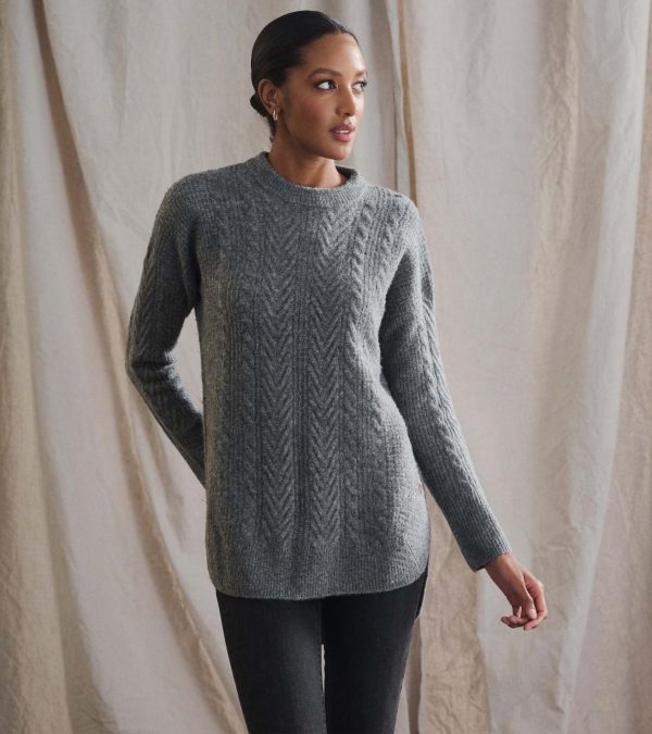 In charcoal heather, this Cable Knit Tunic offers a blend of acrylic, nylon, and spandex, providing both warmth and stretch. The classic cable knit design adds texture, while the tunic length ensures a flattering fit. Perfect for layering over leggings or skinny jeans.
