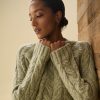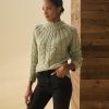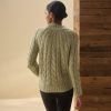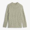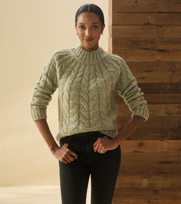 - Cable knit design that radiates from neck seam